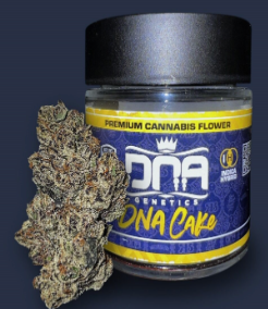 DNA Cake is an indica dominant hybrid strain (80% indica/20% sativa) created through crossing the potent Gelato 33 X Wedding Cake strains. Beloved for its amazing flavor and gorgeous appearance, DNA Cake is perfect for any fan of classic indicas. This bud has a sweet and nutty vanilla cake flavor with a lightly minty sour gelato exhale. The aroma is very similar, with a sour citrusy overtone accented by sweet creamy vanilla cake and a hint of gassy diesel. The DNA Cake high is just as amazing, with a soothing nighttime overtone that's great for helping you get to sleep when it just won't come. Your mood will feel boosted and your mind will be filled with an expansive euphoria that leaves you with no room for bad moods or negative thoughts. A deep physical calm accompanies this heady state, helping your body to truly stretch out and relax before you finally get to sleep. Combined with its high 19-23% average THC level, these effects make DNA Cake a great choice for treating a wide variety of conditions including insomnia, chronic pain, cramps or muscle spasms and depression. This bud has dense oversized heart-shaped minty green nugs with amber undertones, thin orange hairs and tiny golden-white trichomes.